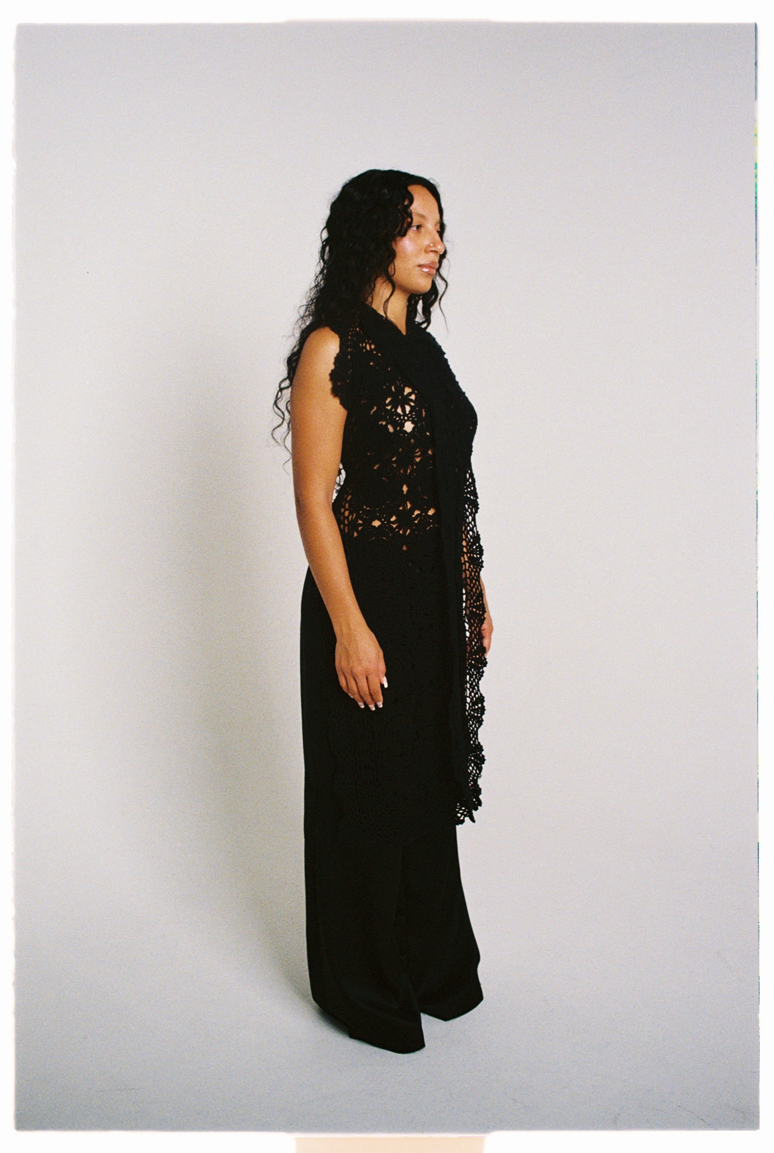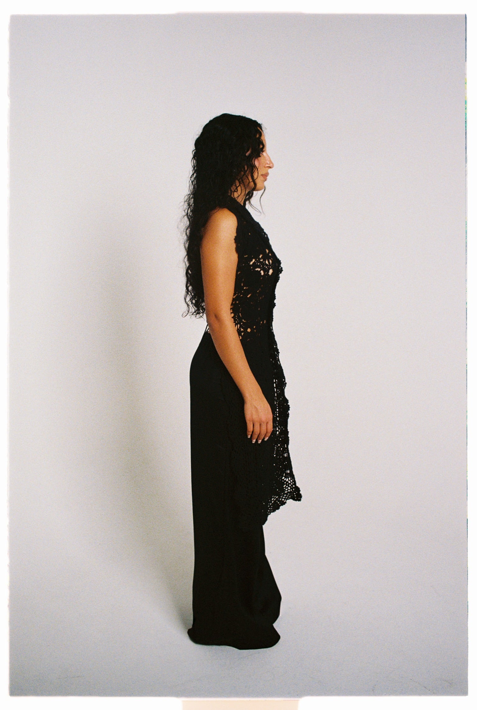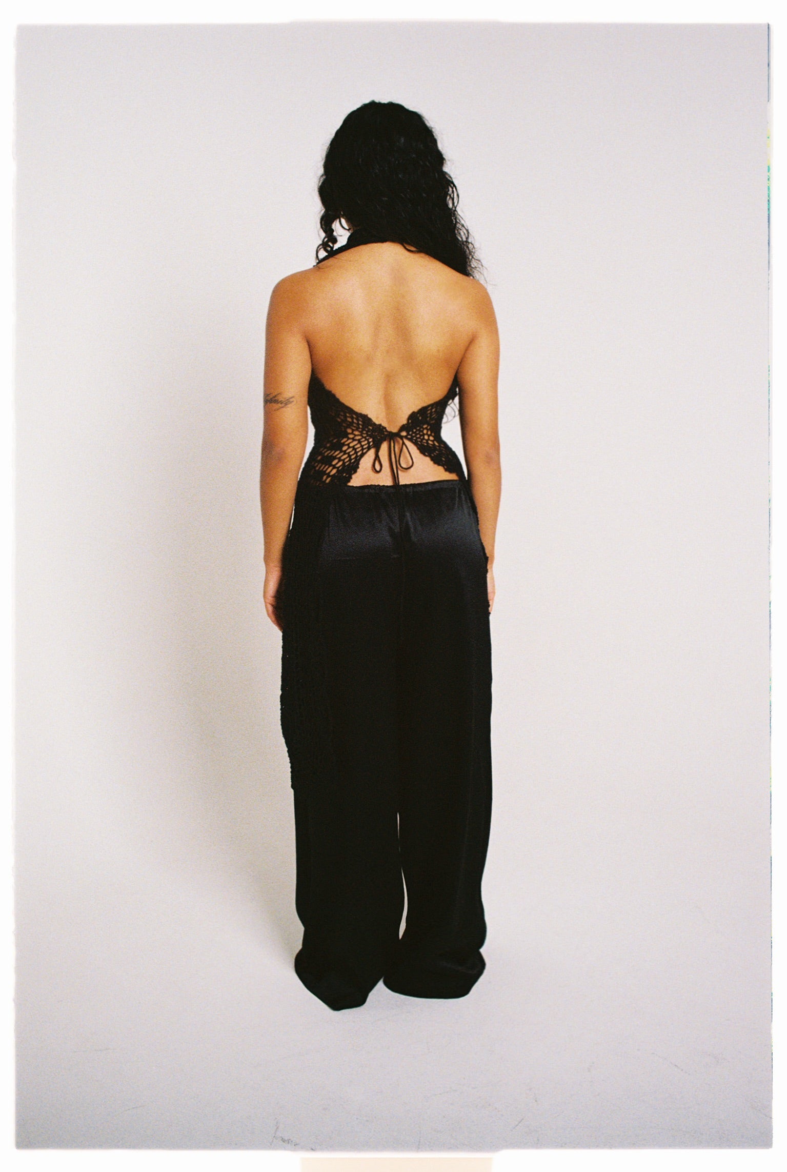 An open-back crochet halter, crafted with delicate floral motifs. Designed with a mocked neckline and a fully adjustable tie at the back, allowing you to shape it to your body. Backless and airy, it layers beautifully.