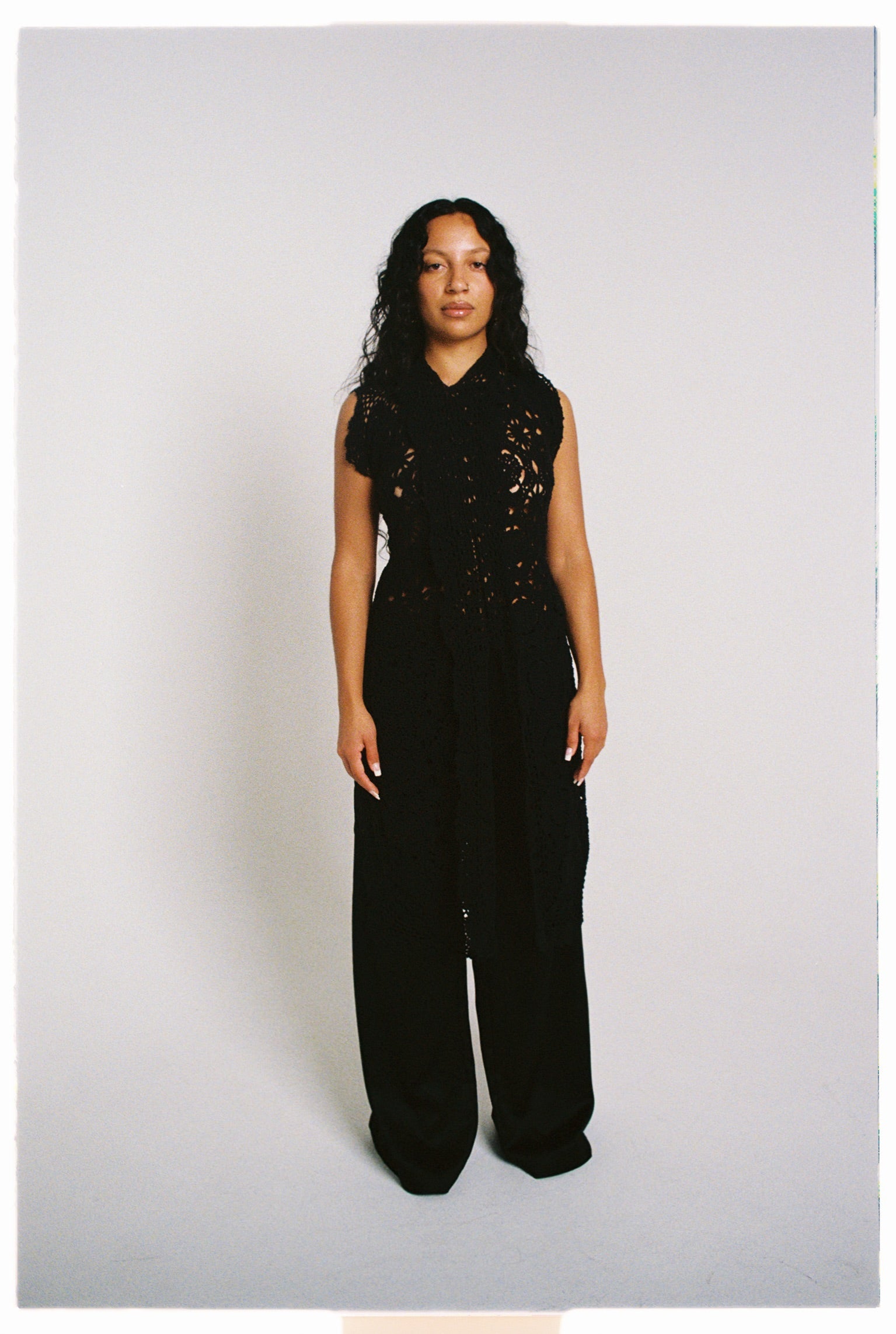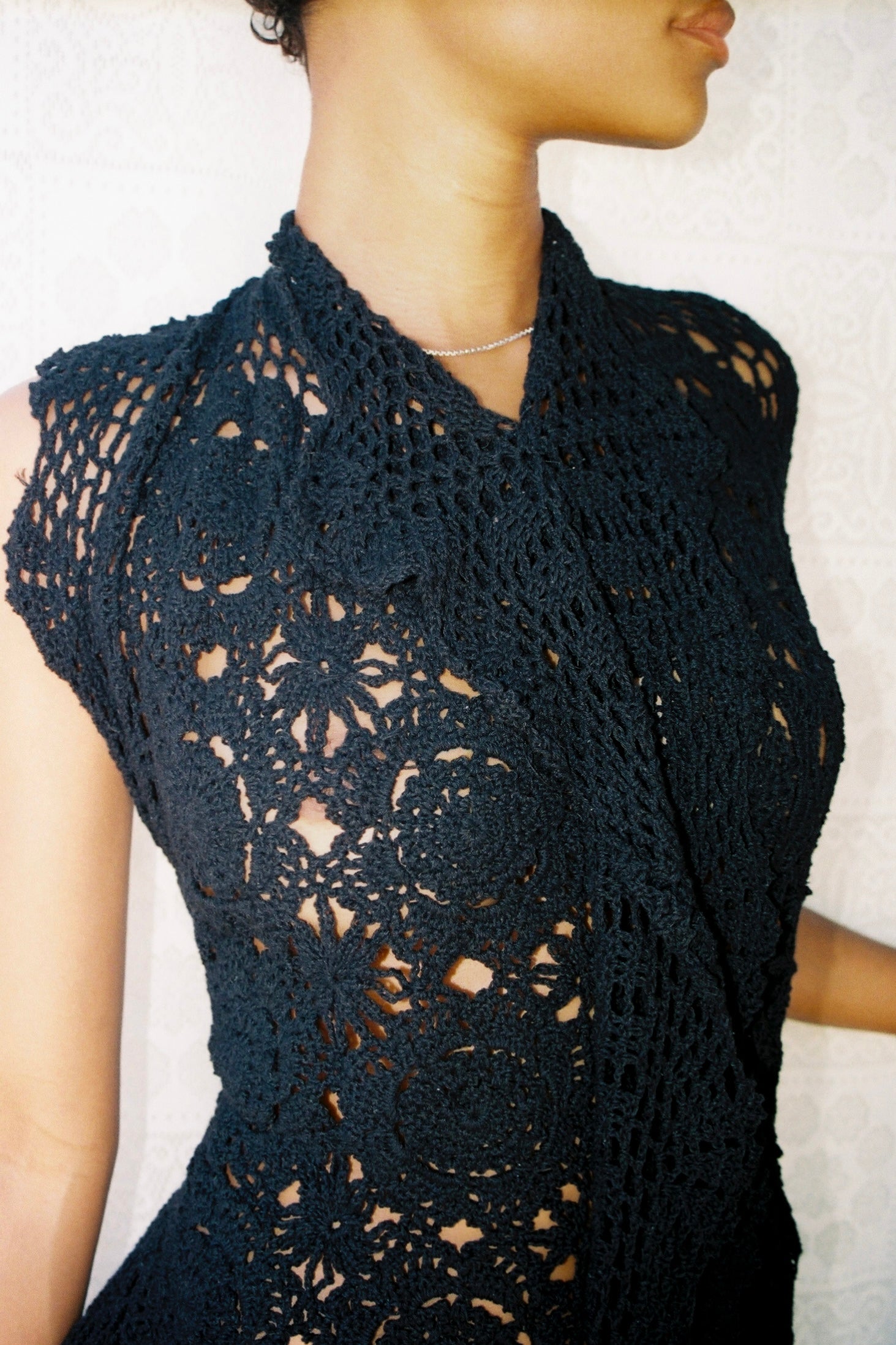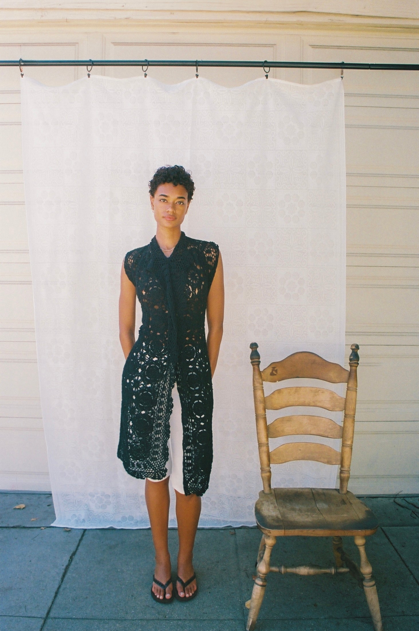 An open-back crochet halter, crafted with delicate floral motifs. Designed with a mocked neckline and a fully adjustable tie at the back, allowing you to shape it to your body. Backless and airy, it layers beautifully.