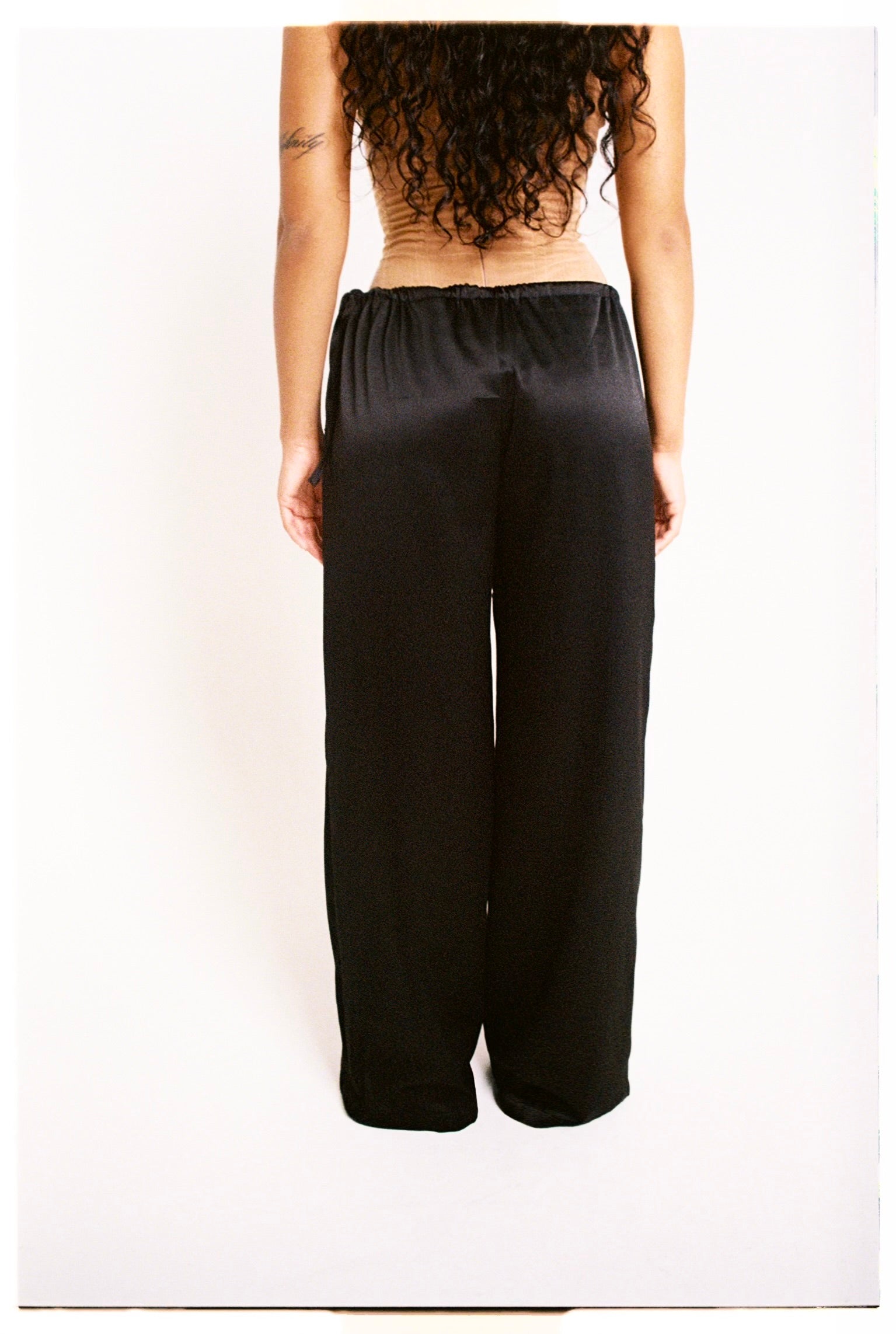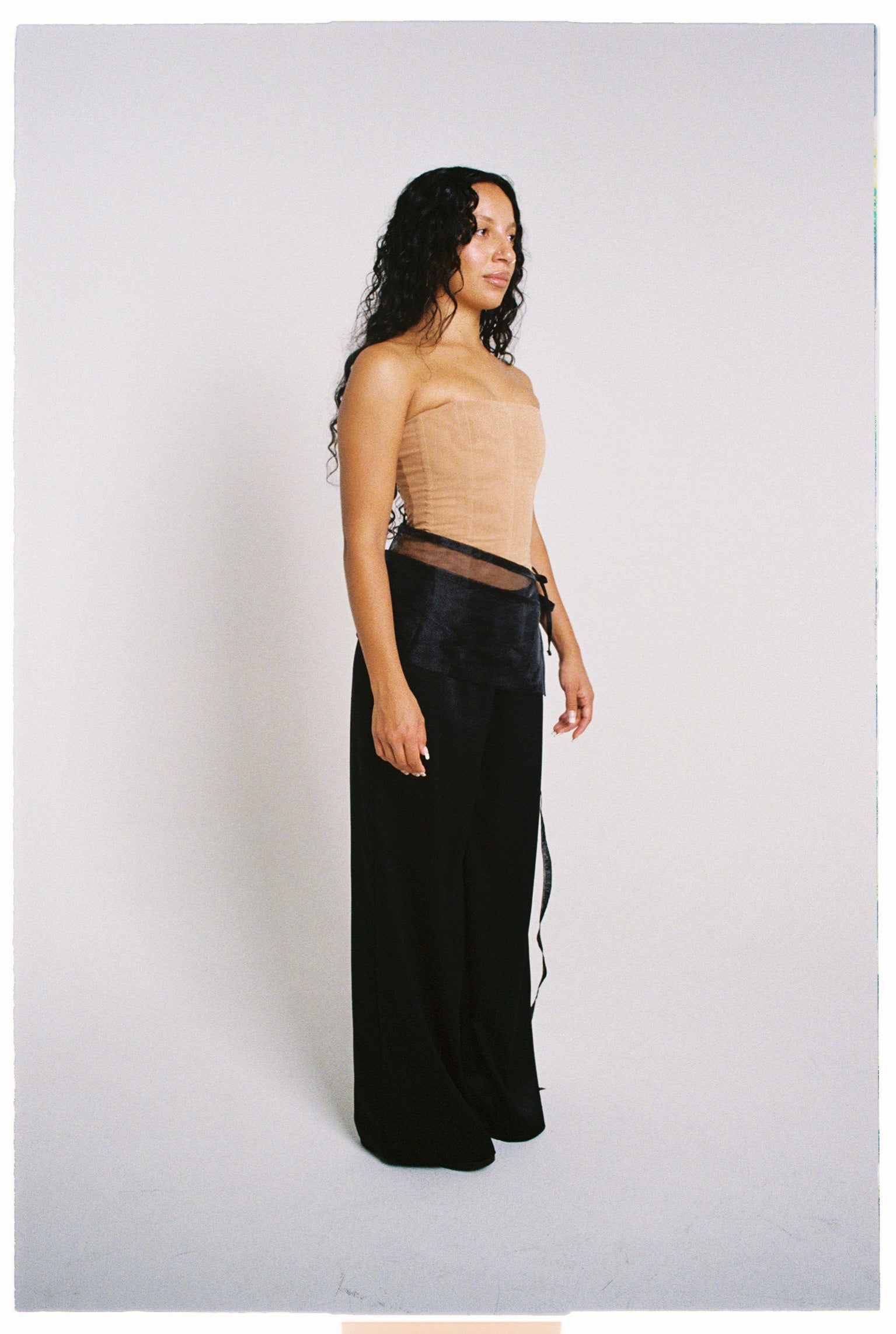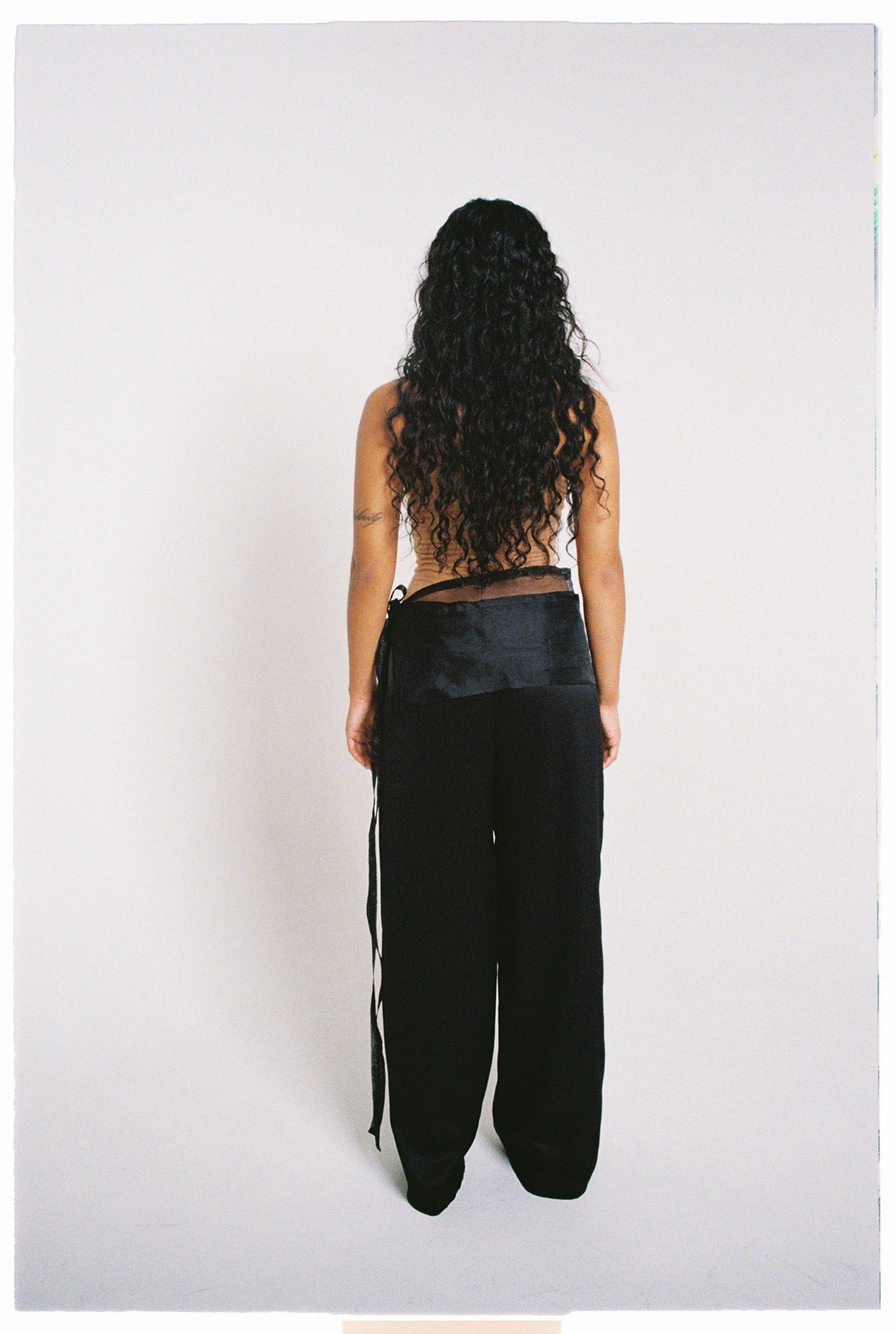 Cut from fluid triacetate satin, this wide-leg pant drapes with effortless ease. Designed without a stretch waistband, it can be worn low on the hips or higher at the waist, secured by a soft side tie. The pant comes with a removable silk organza utility belt—two delicate pockets adding both function and subtle detail. A refined balance of structure and ease.